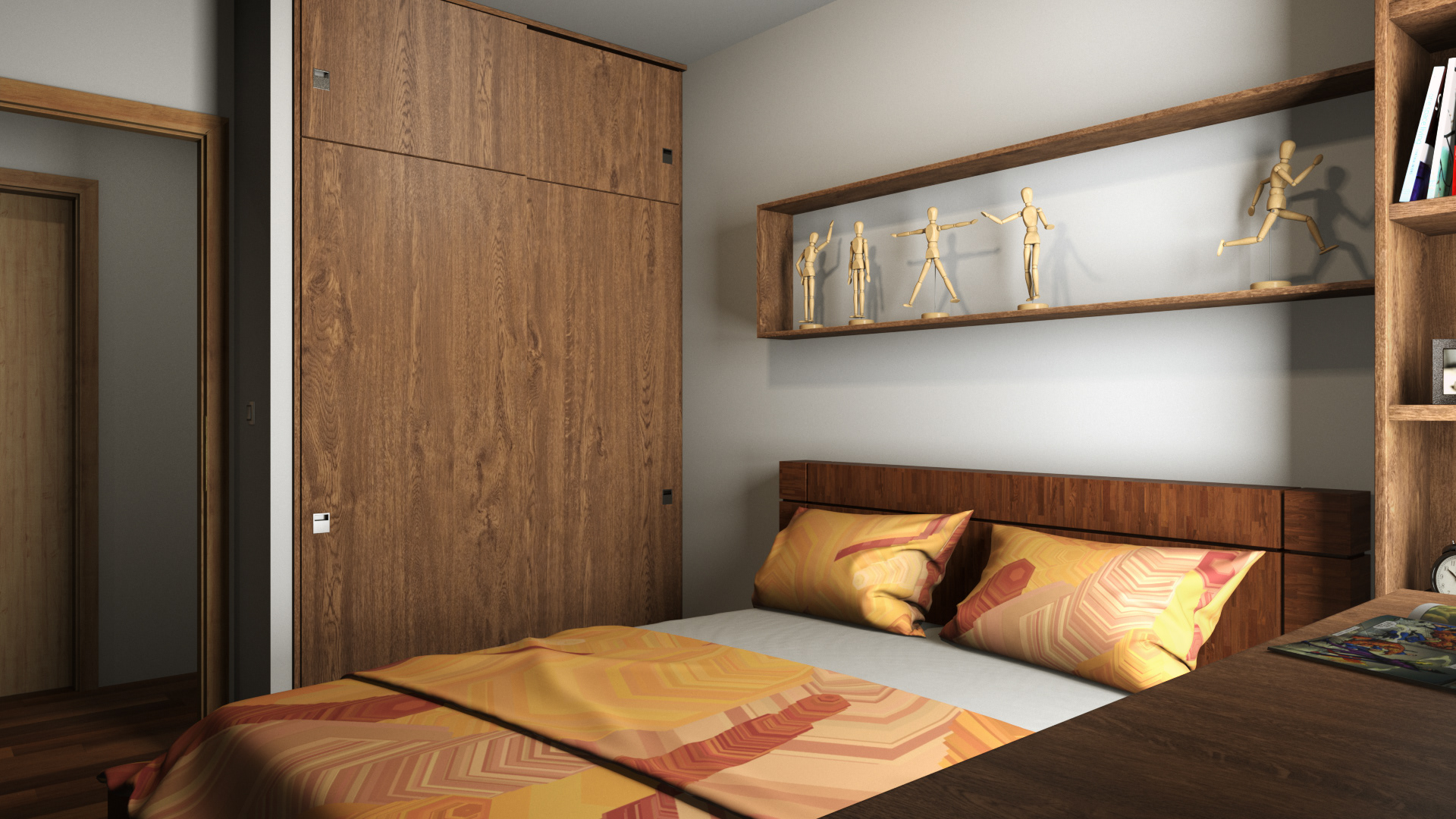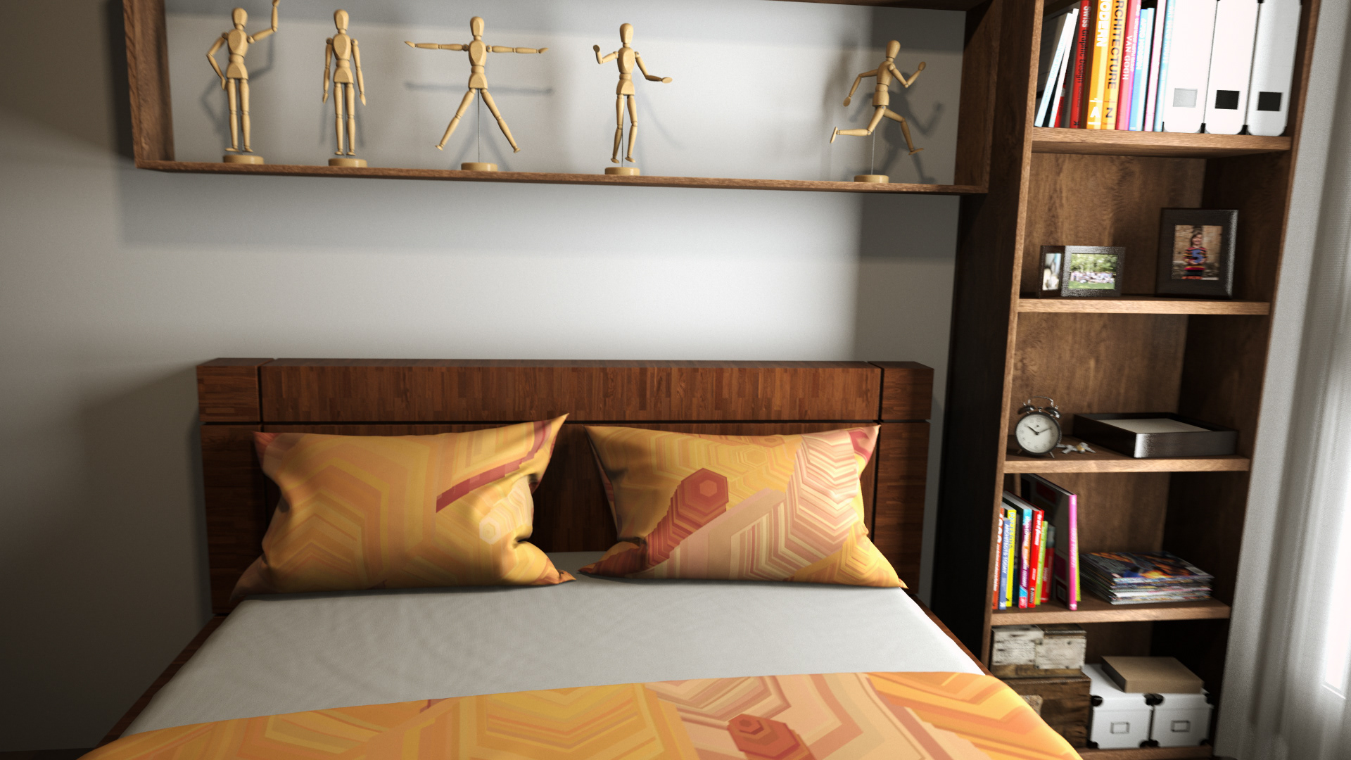 Realistic interior animation of a bedroom, representing accurate dimentions and a possible distribution of the space.